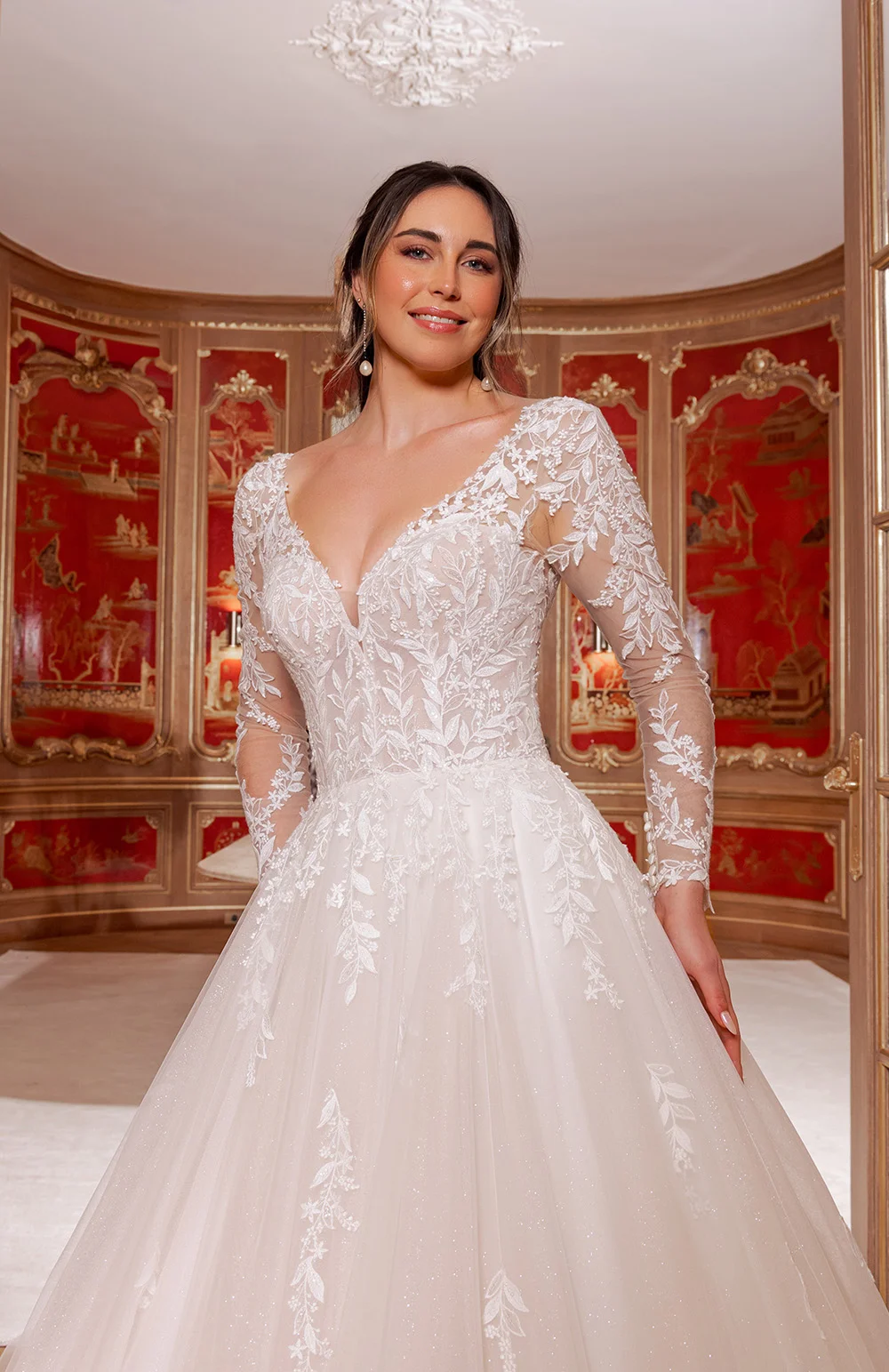Kasia incarne la grâce absolue avec son bustier illusion orné de broderies florales exquises et son décolleté plongeant en transparence délicate.