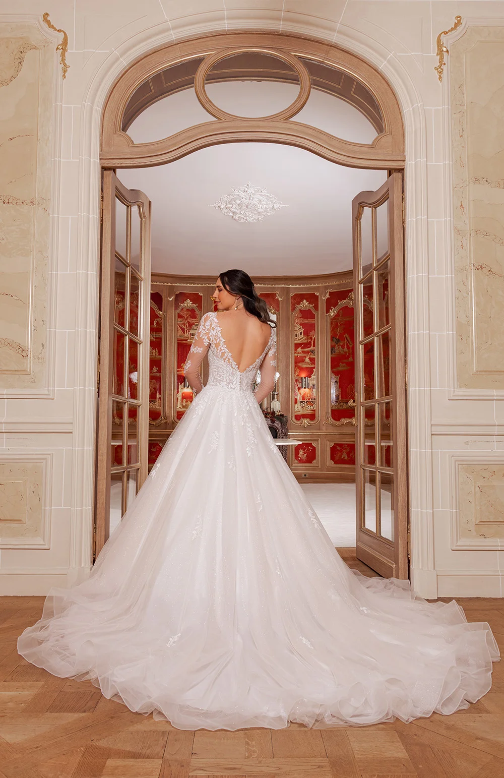Le dos en V profond, encadré de dentelle raffinée, achève ce chef-d’œuvre romantique d’un souffle de modernité impériale.