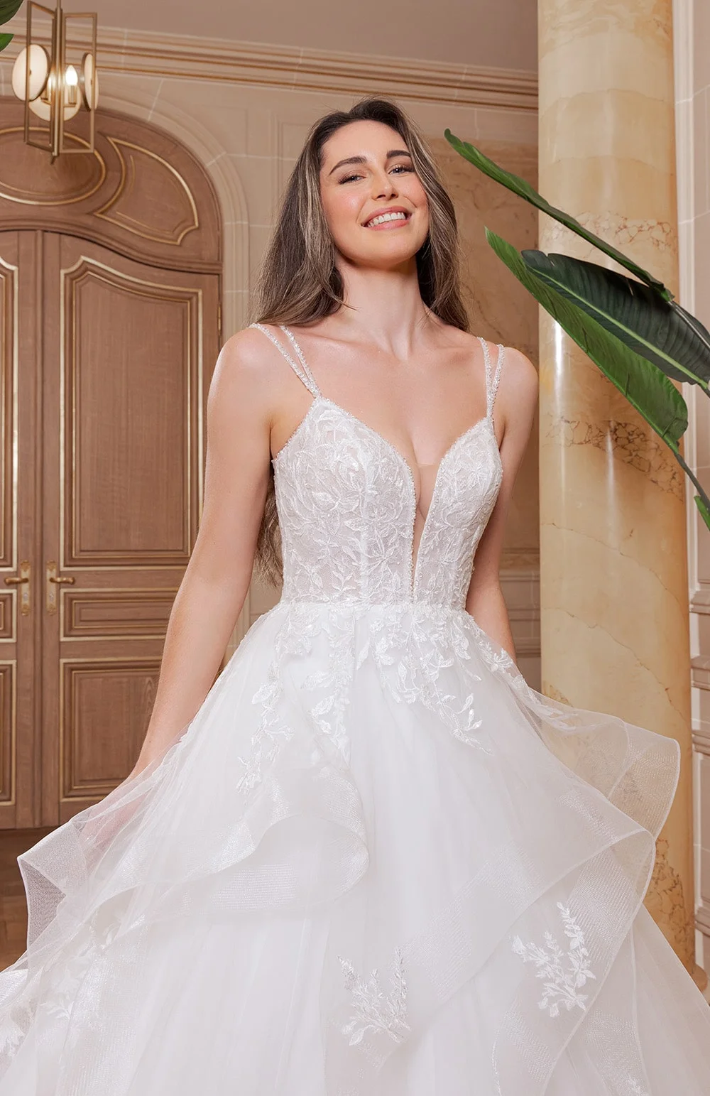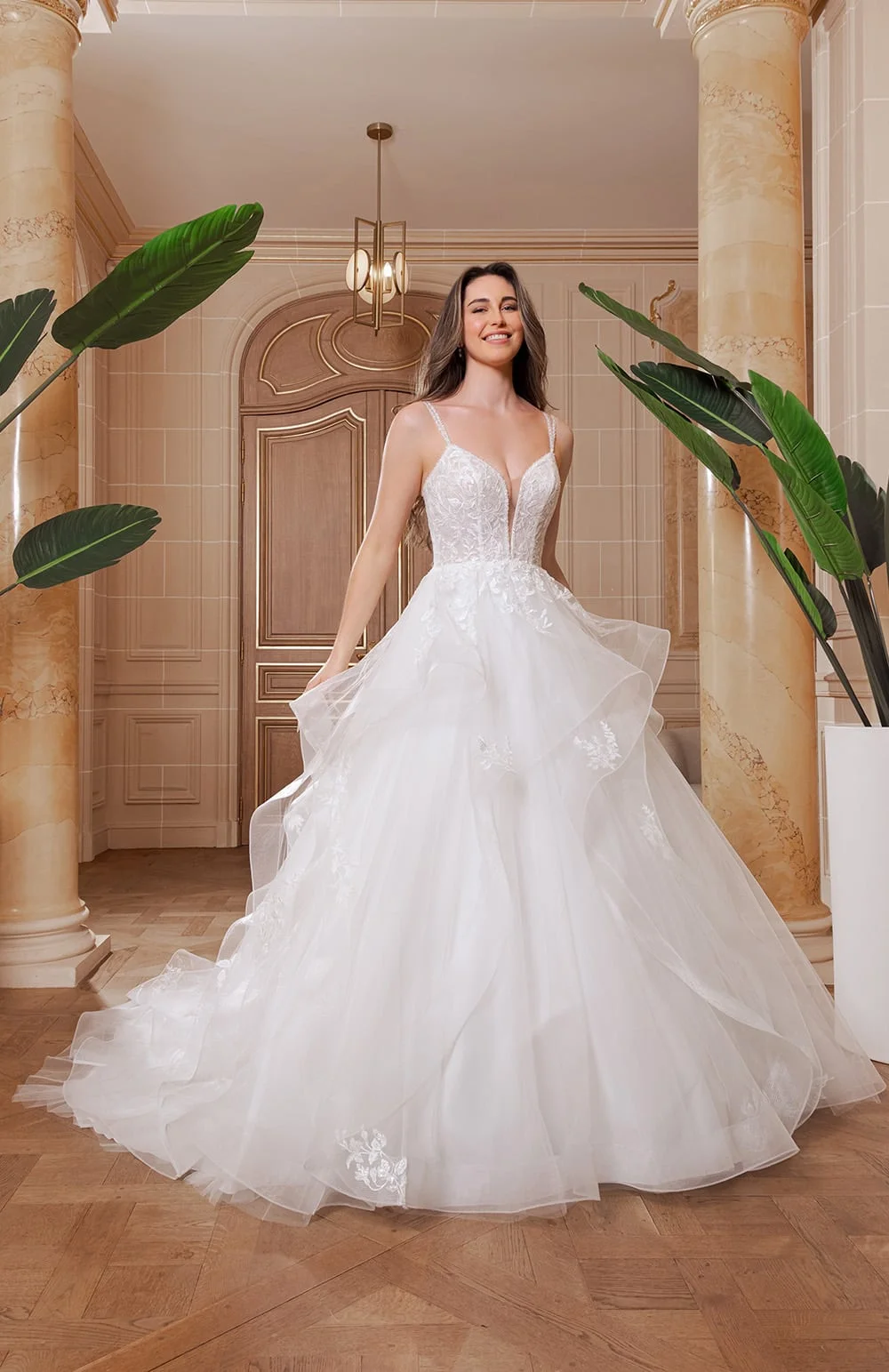 Kamélia séduit par son raffinement et sa légèreté. Son corsage en tulle rebrodé de dentelle florale et de perles délicates met en valeur un décolleté profond encadré de fines bretelles perlées.