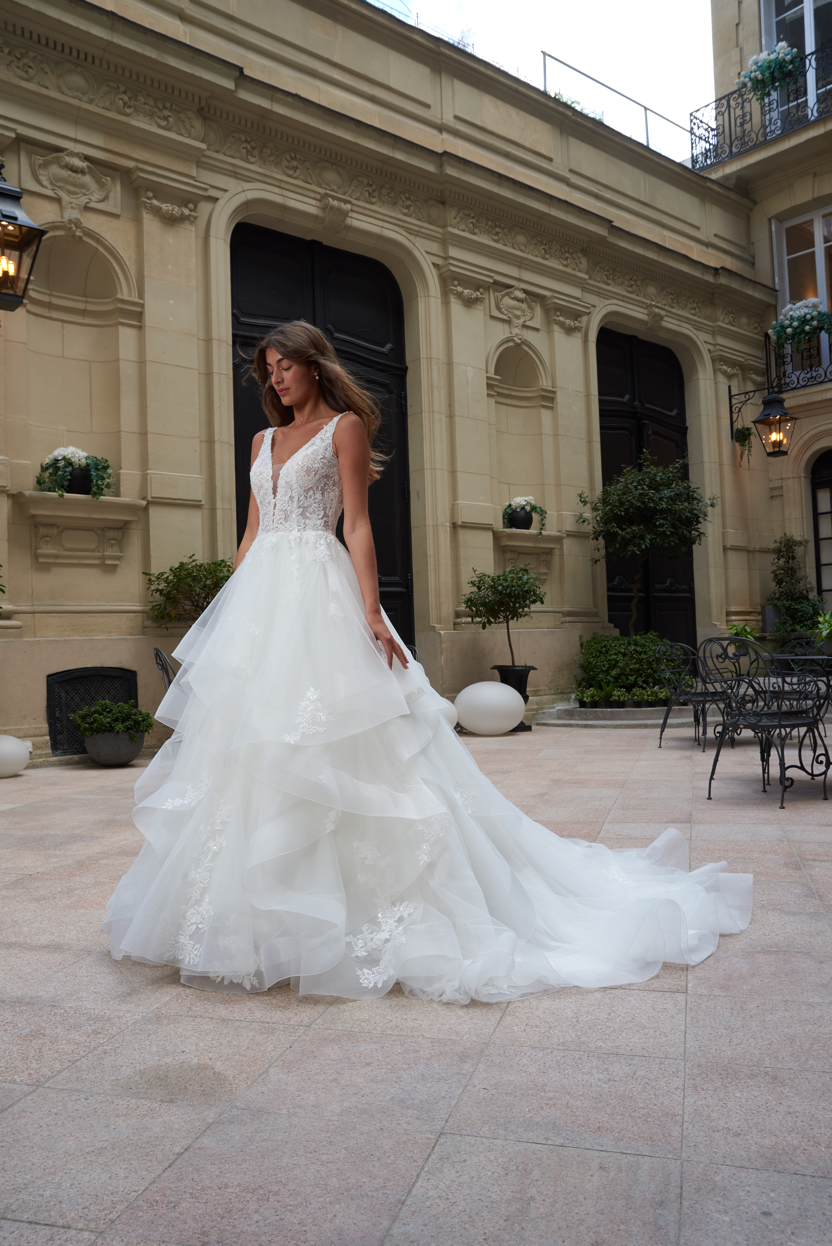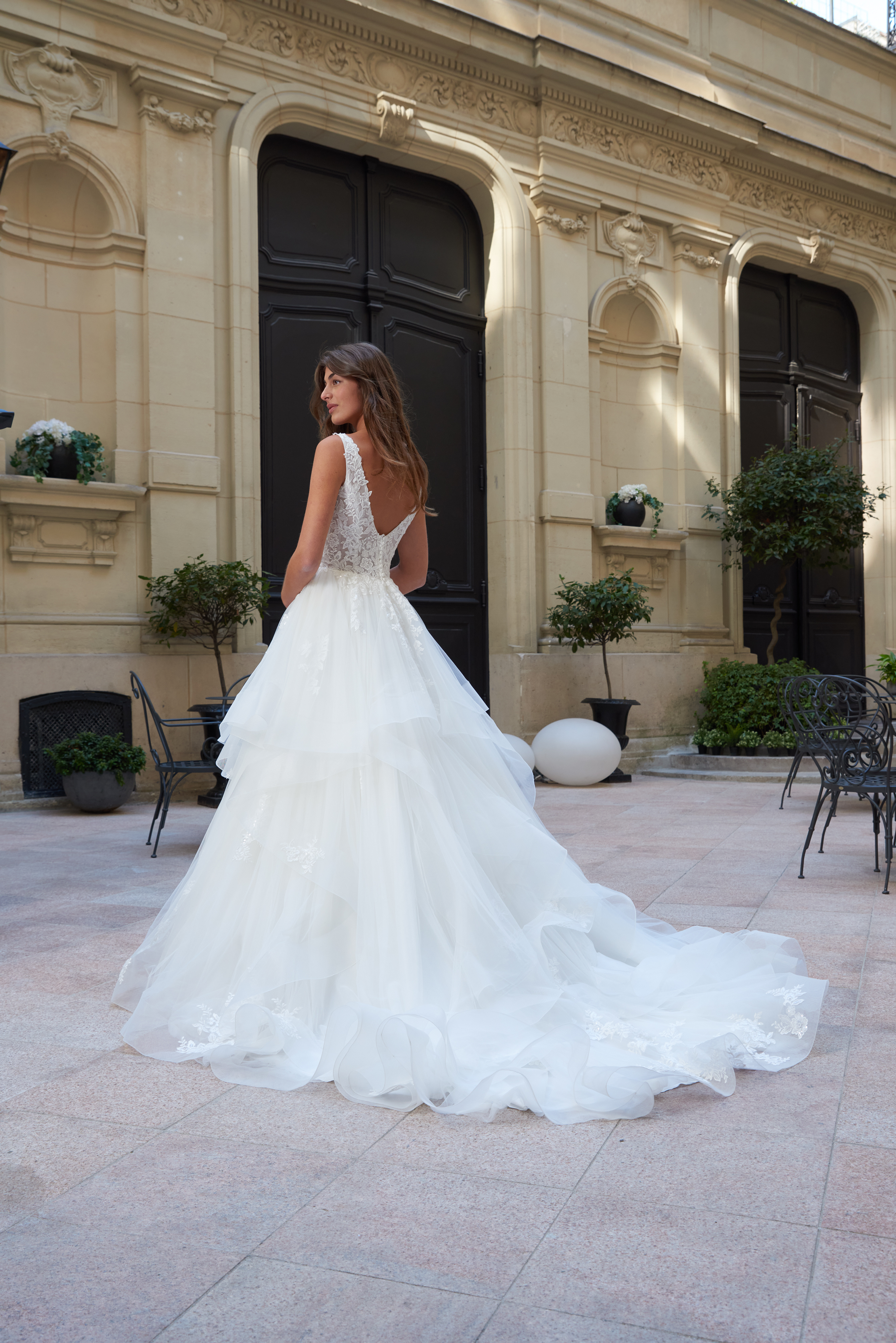 Jupe princesse en tulle garnie de volants et d’appliques de dentelle, traîne.