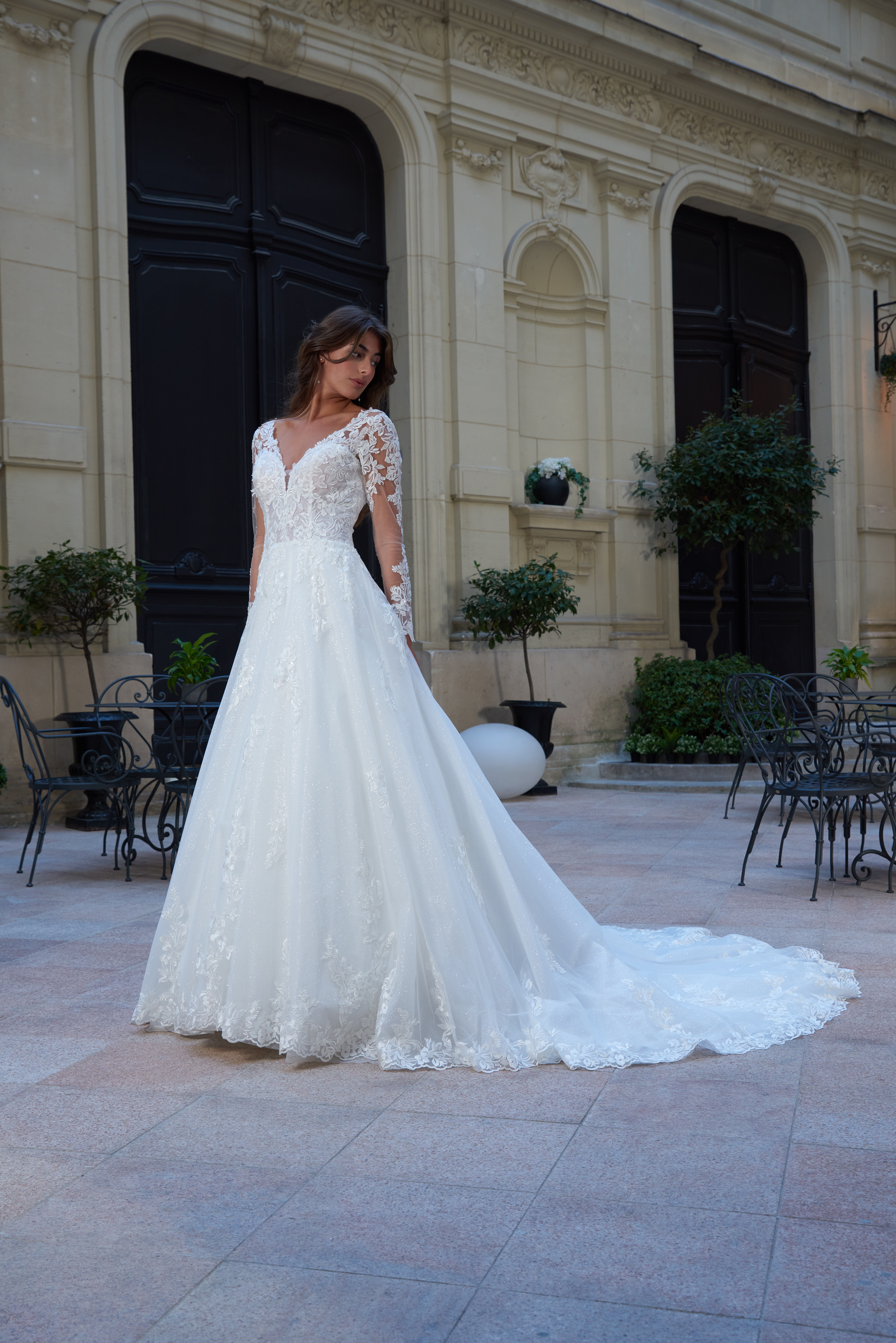 Jupe trapèze en tulle pailleté et garnie d’appliques de dentelle, traîne en dentelle.