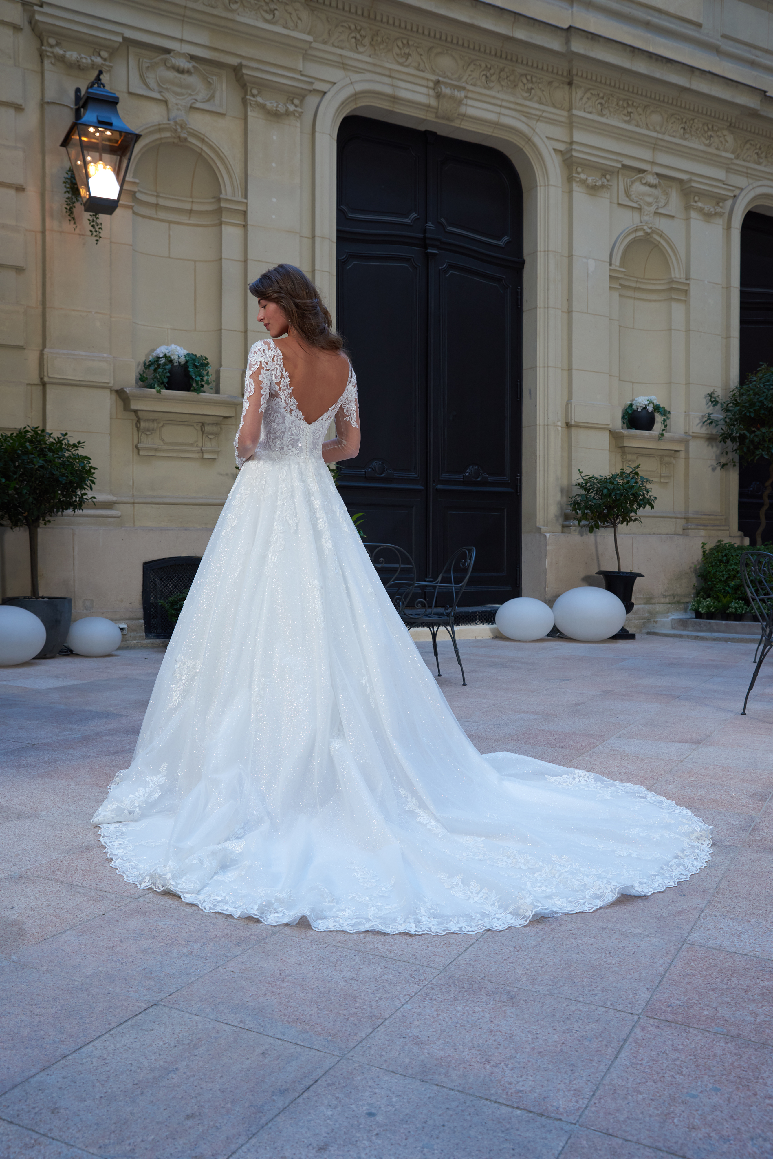 Dos nu “V” en dentelle, fermeture garnie de boutons.