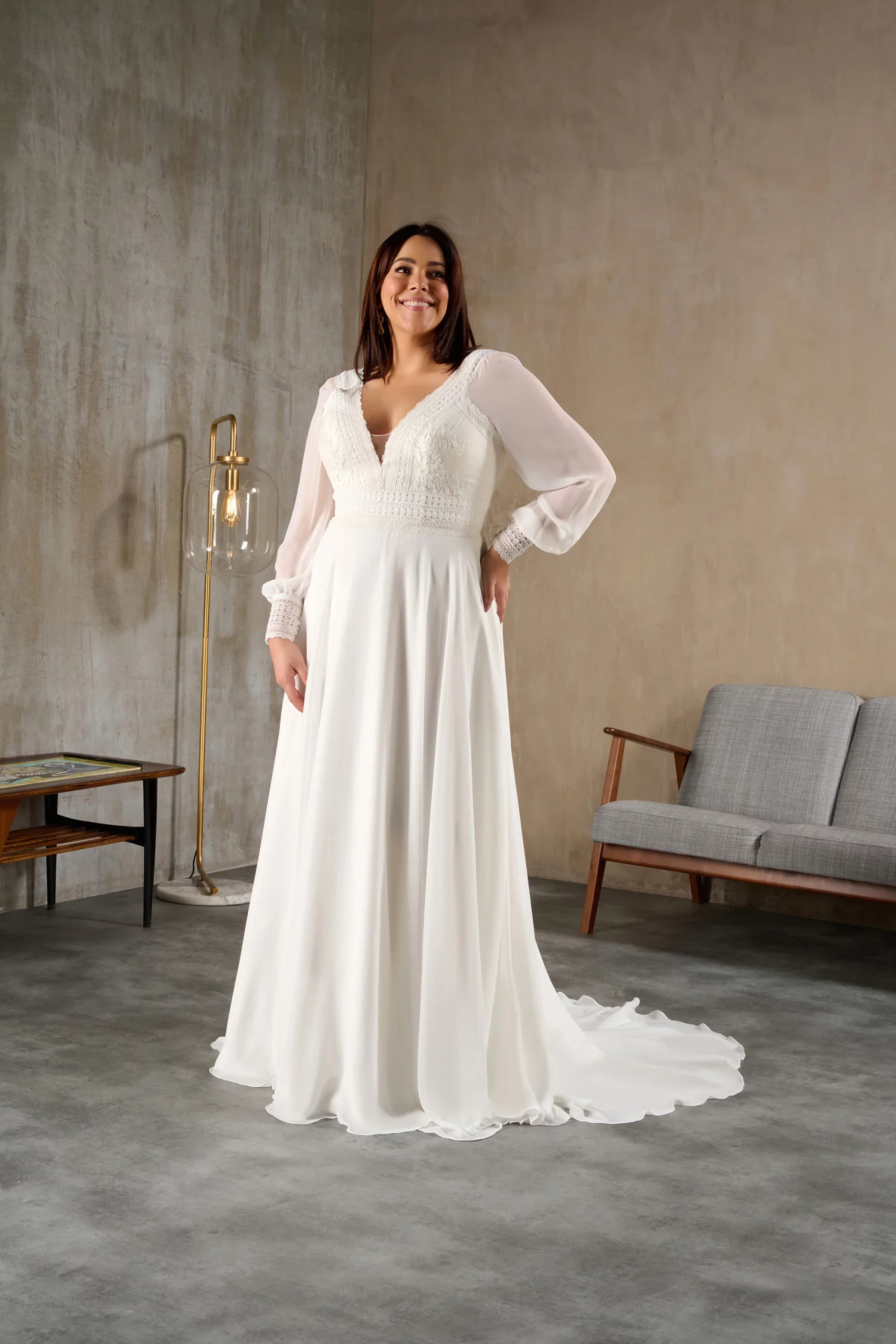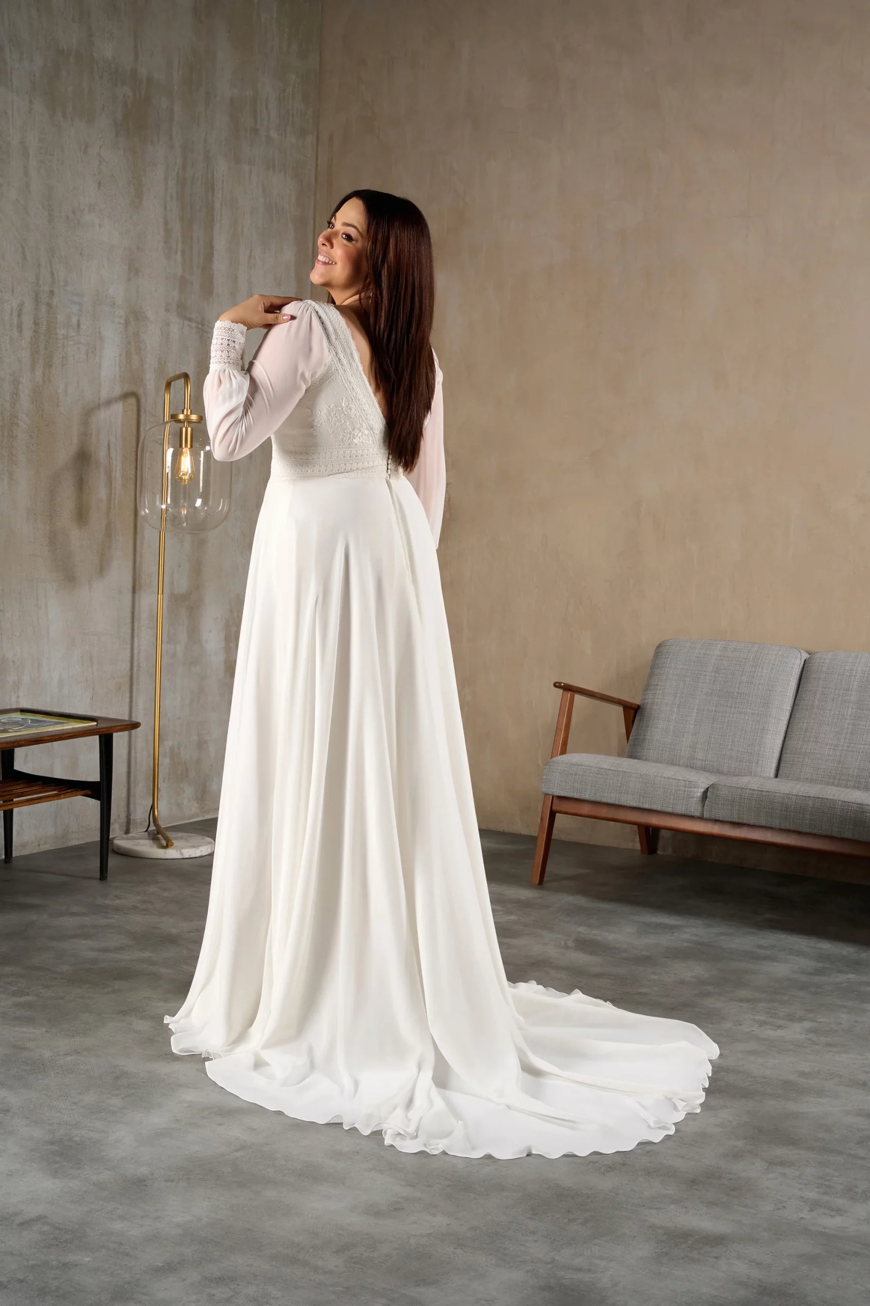 Robe de mariée en mousseline et dentelle.