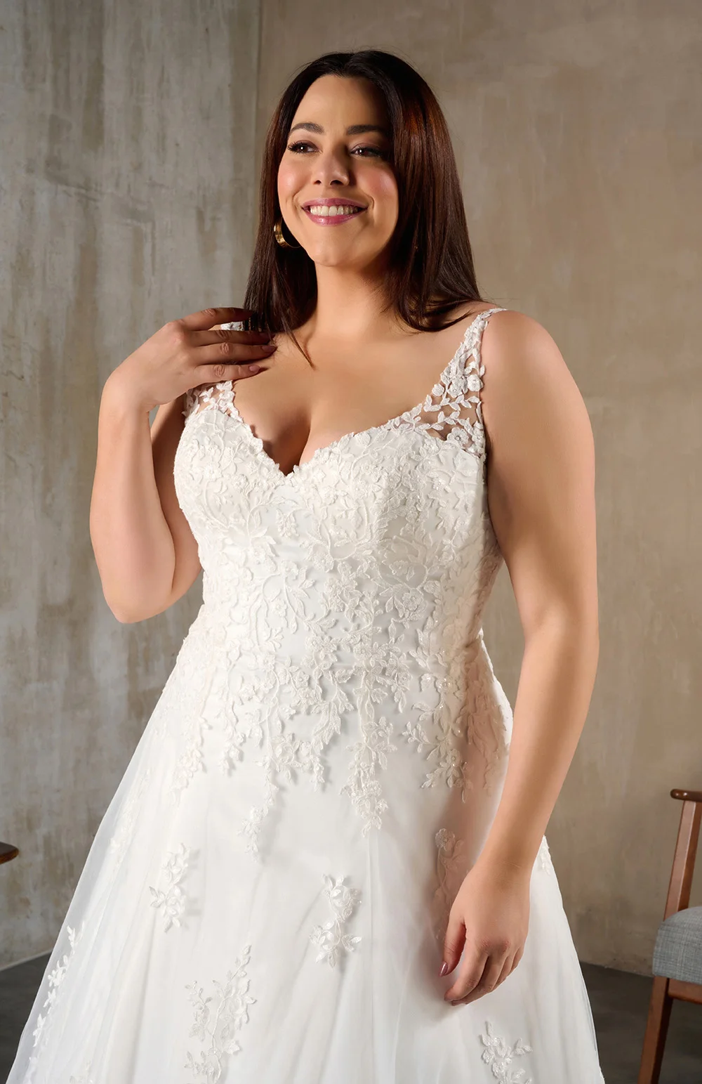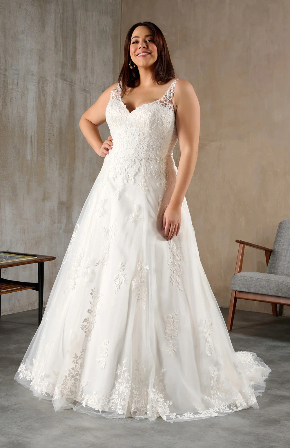 Jupe trapèze en tulle garni de ses appliques de dentelle, traine.