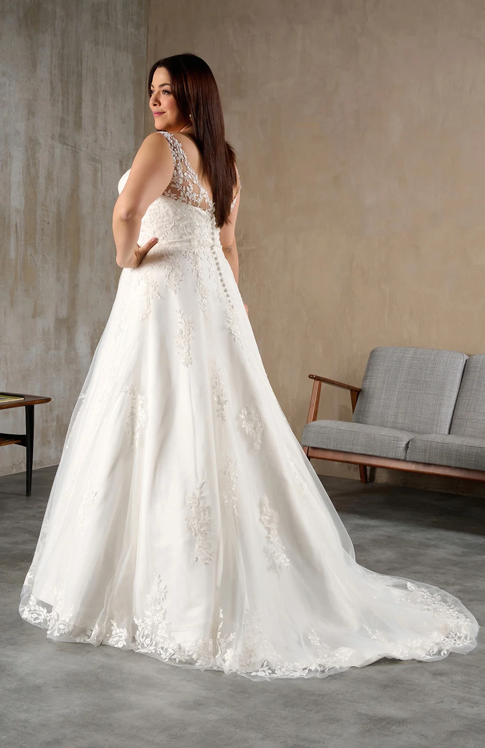 Dos « V » en transparence de dentelle garni de ses petits boutons.