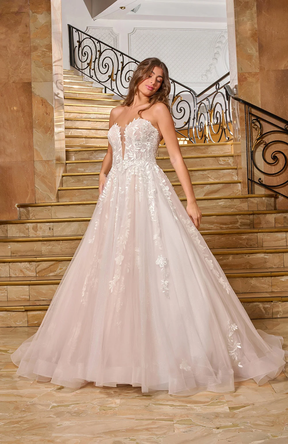 Bustier cœur et décolleté en transparence jusqu’à la taille.