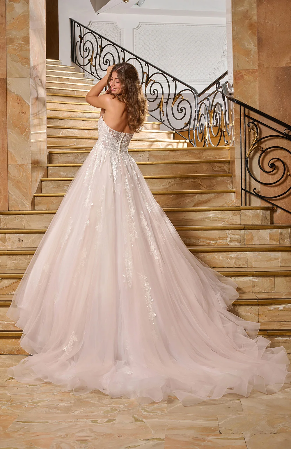 Jupe volume de tulle garnie de ses appliques de dentelle, traine.