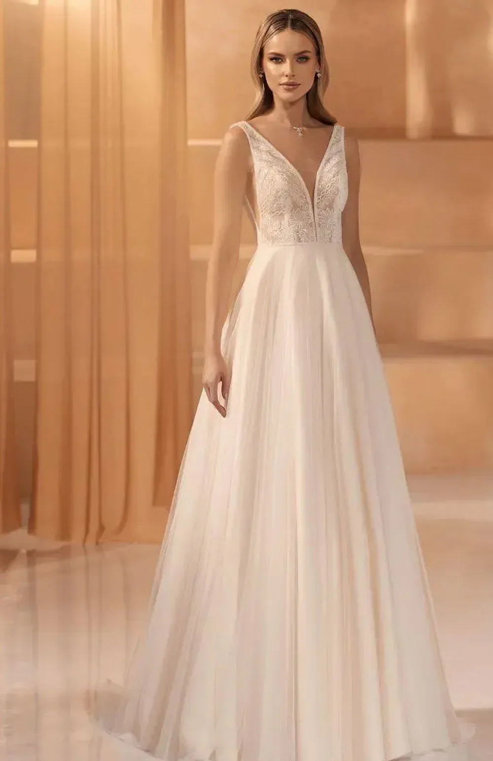 Robe de mariée avec un décolleté en V profond et bustier en dentelle transparente.
