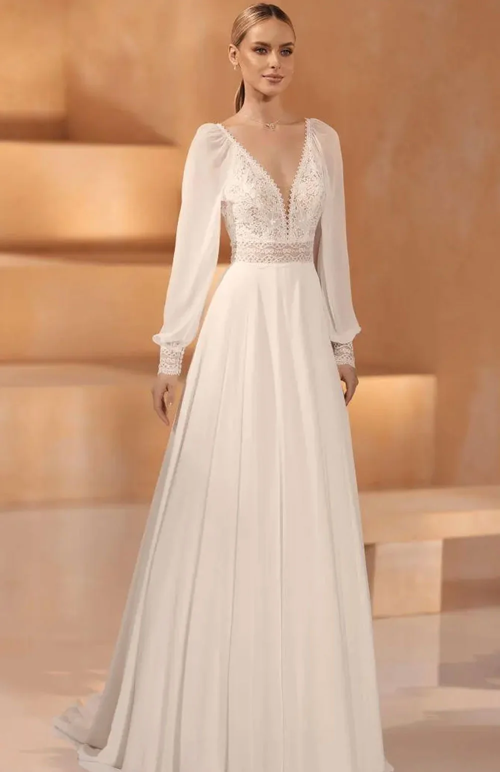 Robe de mariée à manches longues en mousseline avec détails en dentelle au niveau du buste.